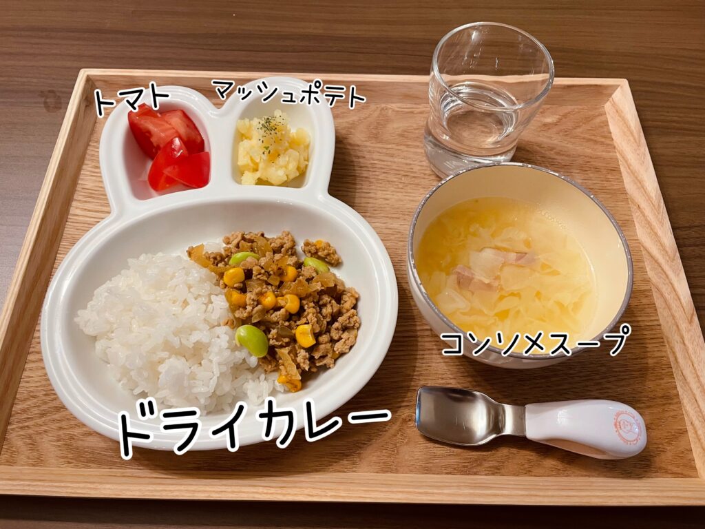 【ひき肉、たまねぎ、枝豆、コーン】を炒めてカレー粉をまぶしました
