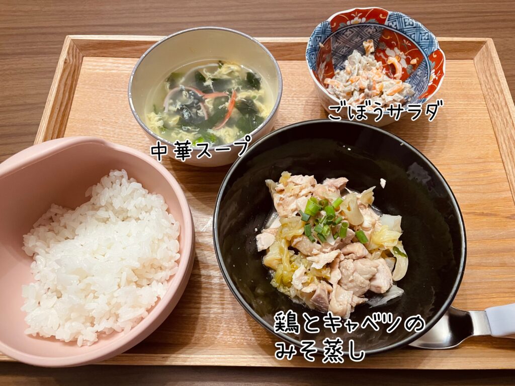 - 〈主菜〉鶏とキャベツの味噌蒸し