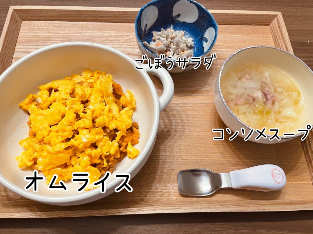 オムライスのケチャップライスには【ひき肉、たまねぎ、にんじん、しめじ】を細かく刻んで入れました